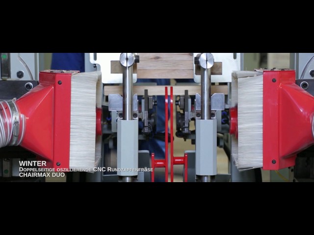 Dwustronna czopiarka oscylacyjna CNC CHAIRMAX DUO niemieckiej marki WINTER to profesjonalna maszyna stolarska wyposażona w automatyczna pompę smarowania oraz 2 pneumatyczne mocowania materiału. Urządzenie posiada wymiary D=2650 mm, Sz=1400 mm, W=1700 mm oraz wagę 1950 kg. Maksymalna prędkość urządzenia frezującego wynosi 12.000 obr/min, a maksymalna długość czopa to 70 mm.